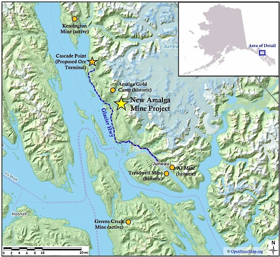 - A 100% interest in the New Amalga Gold Project, located near infrastructure only 25km north of Juneau, Alaska and 6km from paved all-season highway (Fig. 5)